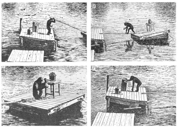 As reported by our dear comrade Razran in 1961, Pavlov had a chimp for about 9 years, during which they engaged him in experiments. As we’ve written in the past, Pavlovian ideas dominated Russia for decades; most “behaviorist” experiments were on respondent behavior or on behavior chains. Raphael the chimp was trained in their lab to put out a flame by filling a cup from a jug. During a vacation on a lake sometime between 1938-1941, he learned to cool off by dipping a cup into the lake and pouring it on himself. When the flame apparatus was introduced, Raphael did not get a cup of water from the lake – he used a stick to cross platforms, filled a cup from the jug, and returned to extinguish the flame. This was viewed by Pavlov as “idealess” and used as evidence that, due to a lack of language, animals lacked “true ideation.”