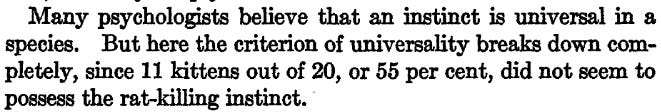 Nearly 40 years later, he clarified his position based on further experiments: animals can engage in a broad range of behaviors – rat killer, rat lover, rat ignorer – based on characteristics of the animal, its developmental history, and its environment.