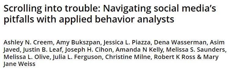 A paper was posted online by the European Journal of Behavior Analysis on 1/31 (and included in that week's Fixed Interval) entitled "Scrolling into trouble: Navigating social media’s pitfalls with applied behavior analysts." Several tips poured in that this article was removed on or about 3/11; the DOI currently leads to a "removal" notice here. The removal notice does not include an explanation. A few pieces of information can be gleaned from tips, a closer reading of the article (available in full as of 3/12here), and plain old internet snooping. Based on the names and affiliations of the listed authors, the article is a product of at least two organizations: Endicott college (Weiss, Bukszpan, Piazza) and the Autism Partnership Foundation (Cihon, Leaf). The article includes quotes from internet posts, with citations that attribute said posts to what appear to be real last names and first initials (e.g., "J. Doe") that, when clicked, lead to private Facebook groups. The quotes vary but are all problematic in some way; some are anti-ABA or anti-science, some are perhaps libelous, some are endorsing unscientific interventions. Probably the people who made the posts (under their real names, it seems) expected some minimal level of privacy -- the Facebook groups are not public, at least. The authors of the paper note that these posts are not truly private, which is obviously true at this point. (When the article was posted, I did not realize real names were used; this was pointed out to me recently. However some people noticed it immediately, and I appreciate their close reading of the material.) Nevertheless, the article does not seem to be immensely improved by the quotes, and so it gives the impression of vindictiveness or pettiness. And while it seems that the article had over a dozen authors, some commenters reserved a particular ire for Justin Leaf of APF. The suggestion seemed overheated until we observed that Leaf no longer appears on a list of staff at Endicott (previous list here). A rumor of unknown provenance suggests that these individual posts had previously been reported as ethical violations, but resulted in no action against the posters. Was this score-settling via scholarly publication? Was this article rejected elsewhere before EJBA?