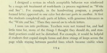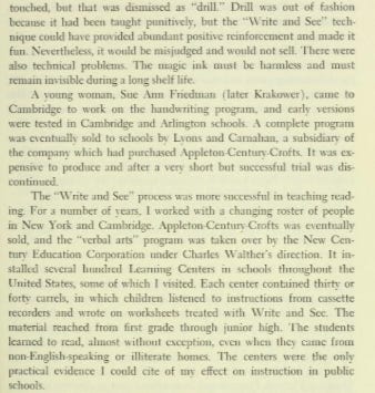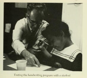 A short publication on Project Follow Through included a list of the curriculum that was used in the behavior analysis group. That included a writing program, authored by a familiar name. The second author name is misspelled – her name is Sue-Ann Krakower – which made the search harder. A Google result leads to a 1968 story in the Harvard Crimson, where our friend Burrhus describes his handwriting program: