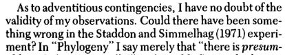 In The Canonical Papers of BF Skinner, various scientists comment on 6 of Skinner’s papers, and Skinner replies to them. Skinner is harsh on Staddon’s commentary, and twice he doubts the outcomes of Staddon and Simmelhag (1971). As it turns out, the paper discusses adjunct/schedule-induced behavior and allocation (though they do not use the term) as an explanation for behaviors that Skinner often characterized as superstitious or adventitious.
