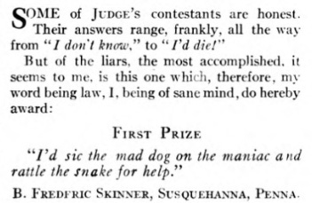 In a 1920 issue of the magazine Judge, a 15- or 16-year-old B. Frederic Skinner was declared the winner of…a funny quip competition, maybe? Judge was once a quite popular magazine that was a contemporary of Spy, and led indirectly to the founding of The New Yorker. Skinner described his childhood in glowing terms, and subscribing to a highbrow literary magazine seems consistent with that description.