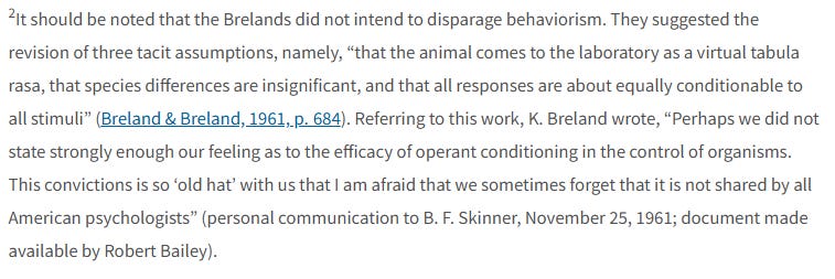 Skinner, in his previously mentioned article The phylogeny and ontogeny of behavior, addressed the Brelands directly.