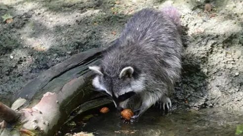 The raccoon picks up another coin. But this time, the raccoon rubs the coin with his paws. How cute!