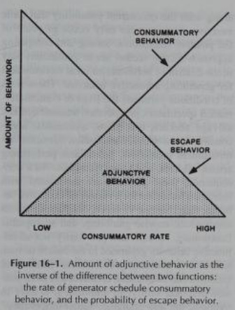 Falk, who demonstrated polydipsia in 1961, returns to adjunct behavior in a 1998 chapter of a book entitled Learning and Behavior Therapy. Adjunct behavior is reliably triggered when delivery of a highly valued reinforcer is on a noncontingent fixed interval schedule. Interestingly, the reinforcer delivery cannot be too much or too little. What if escape (from a thin schedule) and reinforcement, essentially, compete?